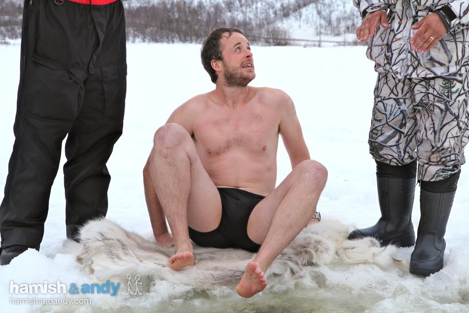 We don’t speak Finnish. But if we did we’d probably discover that there’s an old saying along the lines of “when a man loses a reindeer race, a man loses his clothes. And then has to take a bath in some ice”. Which is handy, because that’s exactly what happened to Hamish after losing out to Andy’s reindeer handling skills.
