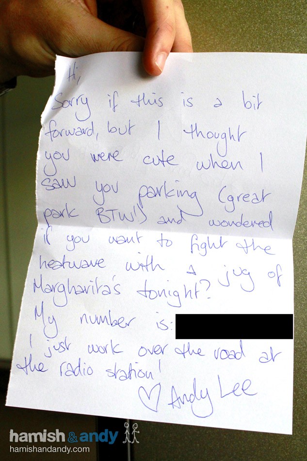 Leaving romantic notes on cars We each put a romantic note on different cars in the street, and waited to see who got the first call and thus wrote the better note. While Andy signed off with an alias, Hamish just pretended to be Andy Lee! 21 Jan 14 Share with your mates Up next Our version of The Big Bang Theory theme song recent videos 11 Dec 25 Non-Tongue Workout 6 Dec 25 Burg Boys 3 Dec 25 Burg Boys Teaser all videos